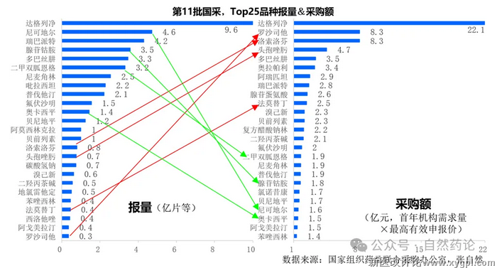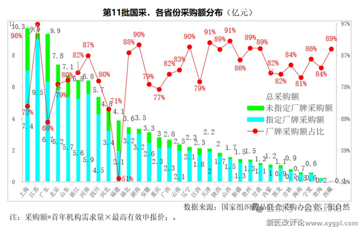 据摩熵医药数据,第11批国采涉及的55个品种,2024年在全医院终端(不含院外药店)销售额492亿元,报量采购额111亿元,后者只占前者的23%。其中,指定厂牌采购额90亿元,占总采购额的4/5,未指定厂牌采购额22亿元,占1/5。
