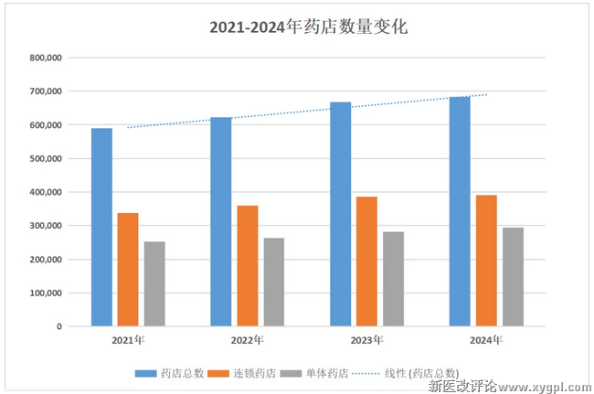 四年间,全国药店数量净增近10万家,年均复合增长率约3.8%。尽管增速在2024年略有放缓,但整体规模仍在扩大,显示行业仍在持续整合与扩张中。