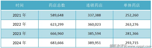 2024年:药店总数683,666家,同比增长2.5%;其中零售连锁总部6,667家,零售连锁门店389,951家,单体药店293,715家。