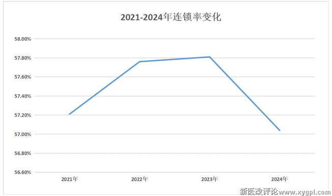 再看全国药店的连锁率数据,截至2021年底,全国药店连锁率达57.21%;截止到2022年底,全国药店连锁率提升至57.8%;2023年,全国药店连锁率变化不大,维持在57.8%。到2024年,全国药店连锁率略降低至57.04%。