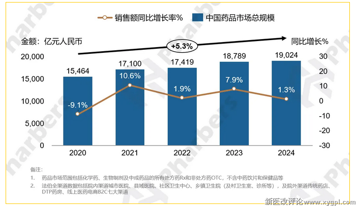 根据法伯全渠道数据显示,2024年全年,我国全渠道全领域药品市场销售额突破1.9万亿元人民币,同比增长仅1.3%,主要受集采扩面和医保控费影响增速放缓(图1)。发展特征方面,2024年中国医药市场仍以 “控费、提质、创新” 为主线,通过集采扩面、医保支付改革、创新药支持等组合拳重塑行业格局。