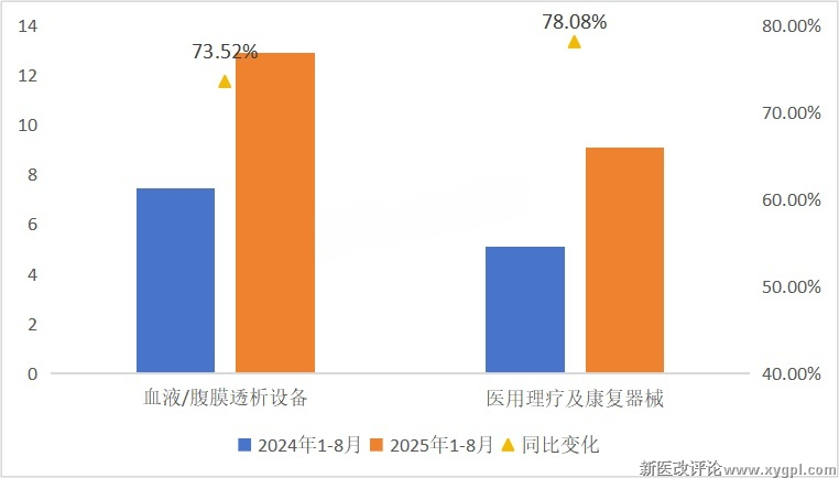 2024年1-8月 vs 2025年1-8月国内县域医共体采购血液/腹膜透析及理疗康复设备市场规模及同比变化(单位:亿元)