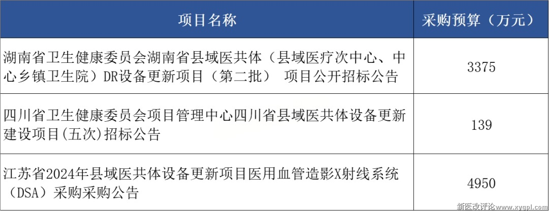 例如,江苏省卫健委牵头的江苏省2024年县域医共体设备更新项目医用血管造影X射线系统(DSA)采购公告中,计划采购6套DSA,分别安装在江苏省6家不同等级的县域医共体牵头医院。