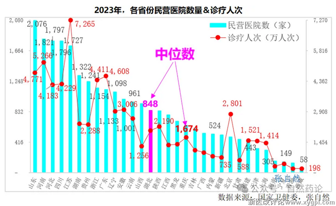2023年,全国共有民营医院26583家,占全国医院总数(38355家)的69.3%,是公立医院的2.3倍。超过1000家民营医院的有11个省份,不足500家民营医院的有9个省份。中位数是江西,有788家。
