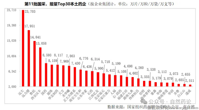 第11批国采,395家本土药企报量27.7亿片,占中外药企厂牌总报量的71%,报量过亿片的企业有4家。