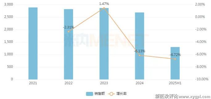 受集采深化冲击、基药制度引导、价格治理施压、监控药市场压缩以及创新药下沉相对不足等因素影响,我国县级公立医院药品市场正处阶段性调整期。米内网数据显示,其2024年销售规模超2687亿元,同比下滑6.13%;2025上半年继续以6.72%的降幅下滑至约1300亿元。