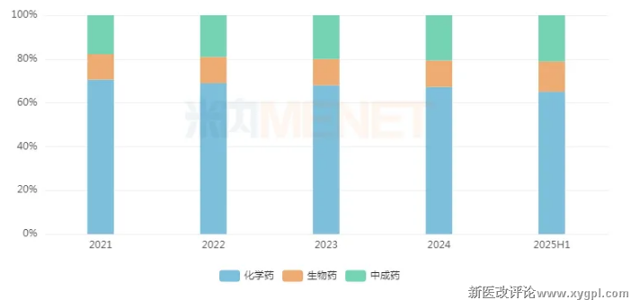 2025上半年药品类型格局方面,化药为主力军,市占比超过65%;中成药市占比超21%,呈逐年增长之势;生物药市占比超13%,近年来在11%-14%之间波动。