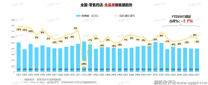 截至2025年7月,全国零售药店市场累计销售规模为2960亿元,同比下跌1.1%;