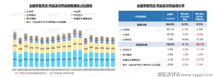截至2025年7月,零售药店药品市场规模占比84.0%,规模同比增长0.5%;非药市场规模占比16.0%,规模同比下滑9.1%;