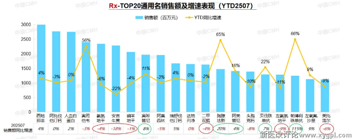 截至2025年7月,处方药TOP20品种中,西地那非、阿托伐他汀钙、人血白蛋白规模位列前三;