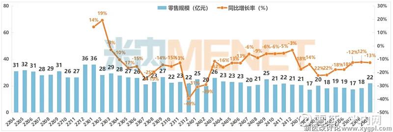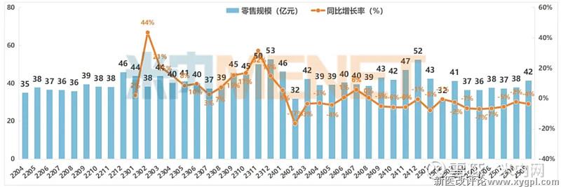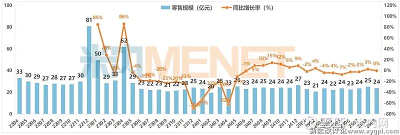2025年9月全国实体药店医疗器械零售规模为24亿元,较8月有4.6%跌幅,与去年同期相比略跌0.2%,属于季度性震动,医疗器械的发展相对恒定。