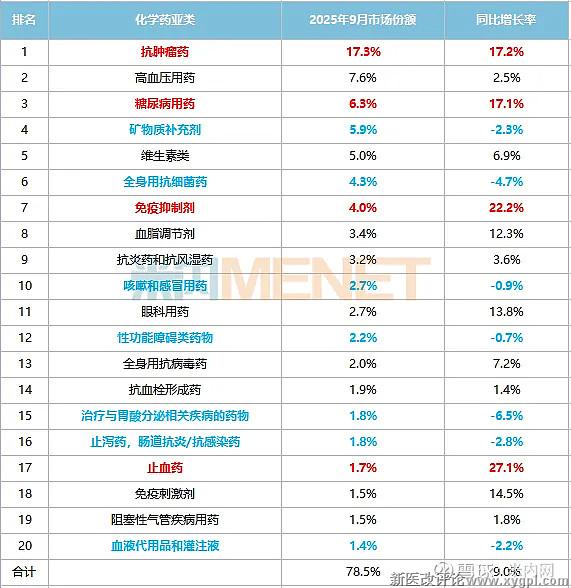 2025年9月中国实体药店化学药TOP20品类份额及增长趋势