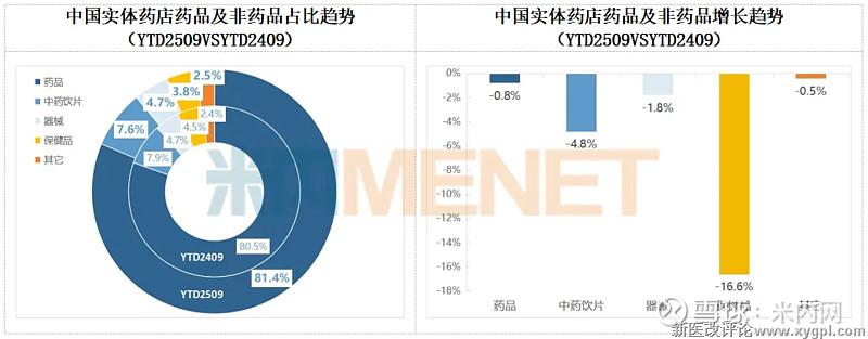 中国实体药店药品及非药品占比趋势、增长趋势(YTD2509 VS YTD2409)