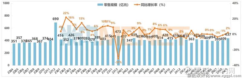 2025年9月,中国实体药店药品零售规模为437亿元,销售较上月增长6.9%,与去年同期规模相比,也有2.2%的涨幅,主要还是依靠创新药拉动了药品市场的增长。
