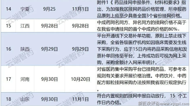 目前,全有已有24省发布正式药品挂网规则文件,包括:河北、新疆、广东、贵州、安徽、青海、山西、内蒙古、甘肃、浙江、广西、辽宁、海南、宁夏、江西、陕西、河南、山东、重庆、上海、福建、湖北、云南、吉林挂网规则已经成文。其余各省均发出征求意见稿并完成了意见征稿。
