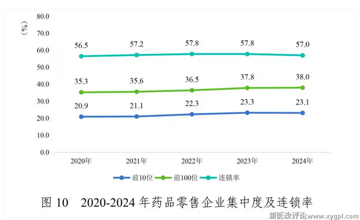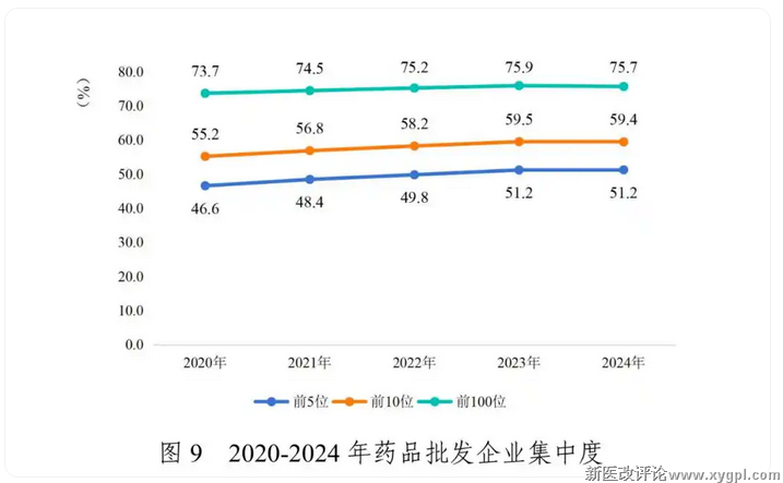 从市场占有率看,2024年,我国前5家全国性药品批发企业主营业务收入占同期全国医药市场总规模的51.2%,与上年持平;前10位占比59.4%;前100位占比75.7%。药品零售前10位企业年销售总额1504亿元,占全国药品零售市场总额23.1%;前100位年销售总额2470亿元,占比38.0%。零售连锁率为57.0%。