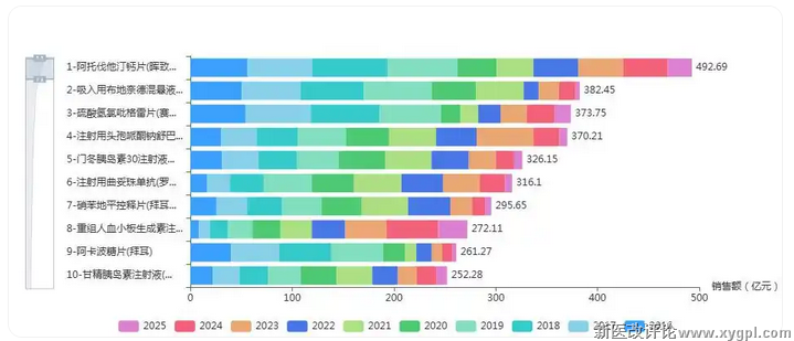 从时间维度看,2020年和2021年是中国医药市场的重要分水岭。2016-2019年,市场整体稳步增长,前十品种累计销售额在2019年达到477亿元的峰值;2020年受带量采购等政策影响,降至353亿元。政策全面推行与新药迭代,直接重塑了多个品种的市场命运。