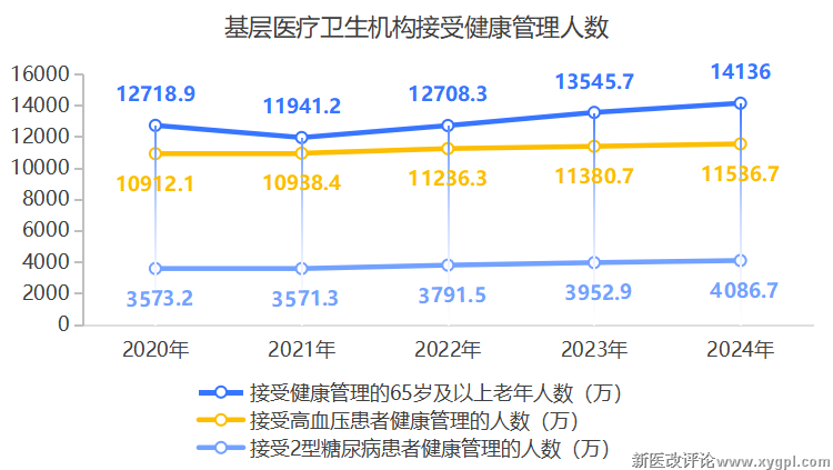 · 2020年至2024年,基层医疗卫生机构中接受健康管理的高血压、2 型糖尿病患者及 65 岁以上人群数量持续攀升,与之相对应的是,基层医疗人员在慢病规范化管理、专业人力配置以及服务承载能力等方面,也随之面临着与日俱增的适配压力。