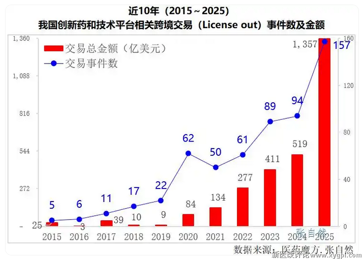医药魔方数据库显示,截至2025年12月31日,中国创新药BD出海授权全年交易总额和交易事件数均创历史新高,交易总额1365.55亿美元,较上年增加840亿美元,增长了1.6倍;交易事件157起,较上年增加63起,增长67%。2025年,有4起海外授权交易的里程碑付款陆续到账,分别涉及百利天恒、中国生物制药、和黄医药和宜明昂科等知名药企。