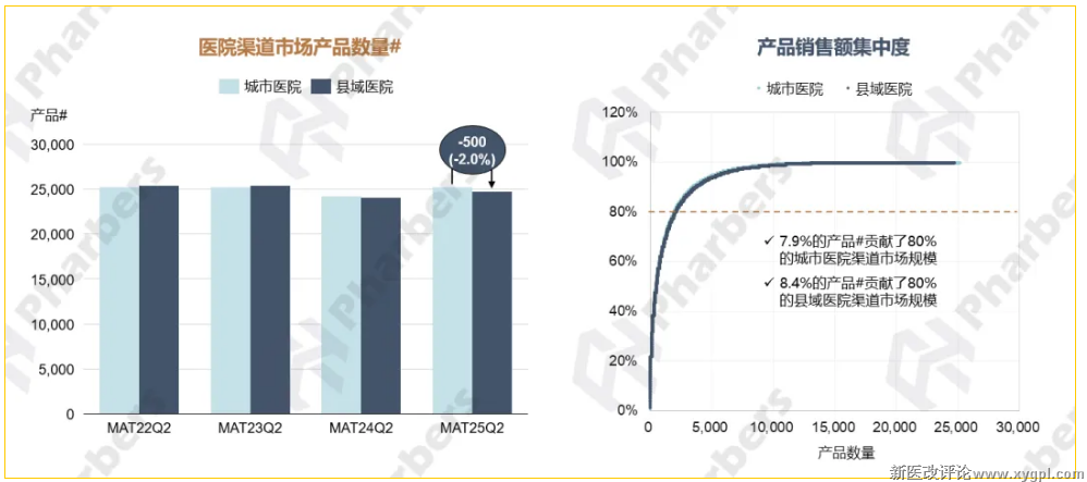 产品方面,县域医院渠道参与竞争的产品数量少于城市医院,集中度与城市医院差异不大(图6)。