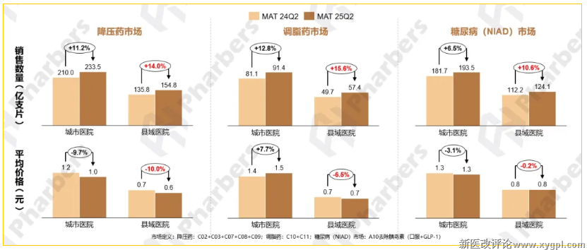 慢病市场的正增长主要来自药品销量的提升(>10%),而平均价格依然呈现降低趋势,特别是调脂药市场,其在县域医院的价格降幅显著高于城市医院(图2)。