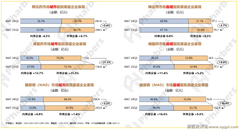 分别关注医院渠道相关慢病市场的内外资企业格局,根据法伯院内渠道数据显示,降压药市场方面,两类医院渠道均是内资企业销售额贡献较高,而MAT25Q2的增长却是由外资企业带动的,其中拜耳、诺华表现突出;调脂药市场方面,外资企业在城市医院渠道贡献超70%,MAT25Q2同比增长达到25.3%,而在县域医院渠道,内资企业占比将近50%,且整体增速高于外资;糖尿病市场方面,外资企业在城市医院渠道贡献近70%,无论城市还是县域医院,均是内资企业增速更高(图3)。