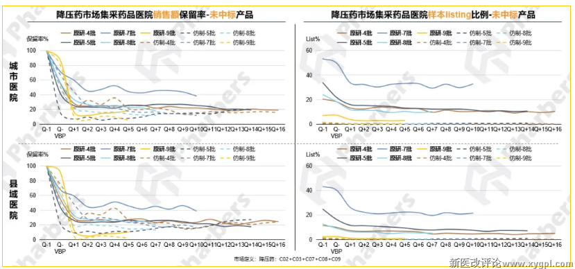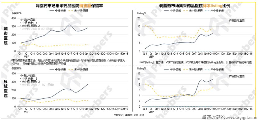 分批次来看,中标仿制产品大致符合高listing比例,销售金额高增长的趋势;未中标原研产品也同样符合高listing比例,高保留率的规律(图9)。