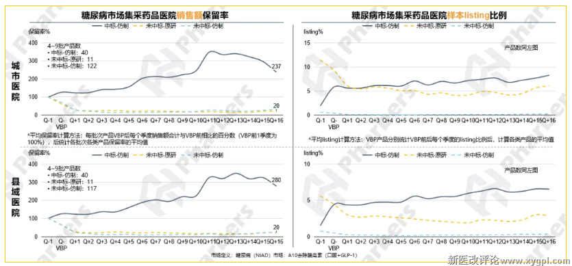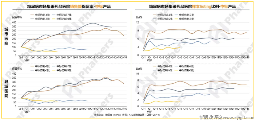 最后关注糖尿病VBP市场,法伯数据显示,中标仿制产品listing比例在城市和县域医院均高于未中标原研;但从保留率角度分析,与其他慢病市场相比,中标仿制产品并未出现明显(3倍)的高增长(图8)。