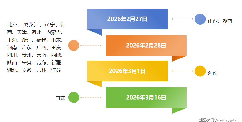 从落地节奏来看,整体推进有序、梯次落地:山西、湖南两省率先启动执行,成为第十一批国家集采落地的先行区域; 北京等 27 个省份则统一以2月28日作为集中执行节点,形成全国大范围同步落地的态势; 而甘肃作为最后发布通知的省份,虽然执行时间最晚,却为这场跨越31个省市的政策接力画上了完整的句号。