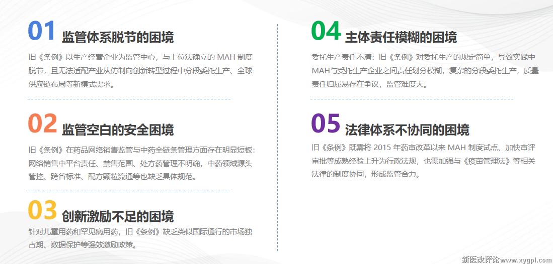 通过 明确 MAH责任固化、创新保护多层化、生产模式灵活化、网络销售规范化和中药管理分类化 ,构建起适配我国医药产业由“仿制驱动”转向“创新驱动”发展的现代化药品监管体系。