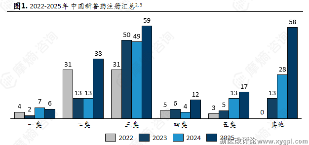 从2025年具体结构来看, 疫苗类产品高度集中于三类注册,化学药物则在二类、三类及五类中分布较为均衡 ,显示不同技术路线在注册策略上的差异。