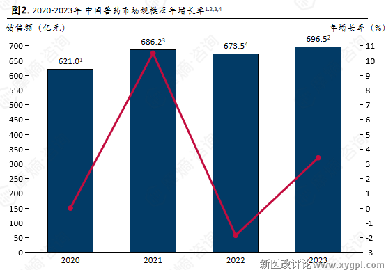 中国兽药行业已经进入了中速、稳健增长的阶段。 中国兽药市场规模从2020的621亿元增长至2023年的696.5亿元左右,总体呈现温和上升的趋势,年增长率在2021年达到阶段性高点,2022年有所回落,但在2023年有所修复。其市场的长期趋势为市场规模总体向上,说明了中国兽药行业具备稳定的刚性需求基础。中国兽药市场的增长率存在一定的起伏,反映出了行业受外部因素(如政策环境、养殖周期等)影响较为明显。