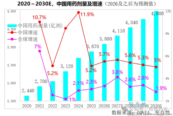 据IQVIA预测,“十五五”(2026-2030)期间,我国用药金额复合年均增长率将进一步下降至1.5%,全球的约为5-8%(取中位数6.5%),我国增速不足全球增速的1/4。