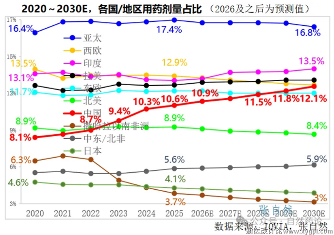 以2025年为例,全球用药量占比排在中国之前的依次是亚太(17.4%)、西欧(12.9%)、印度(12.6%)、拉美(12.2%)、东欧(11.8%),排在中国之后的是北美(8.9%)、中东/北非(5.6%)、日本(4.1%)、撒哈拉以南非洲(3.7%)。(详见下图)