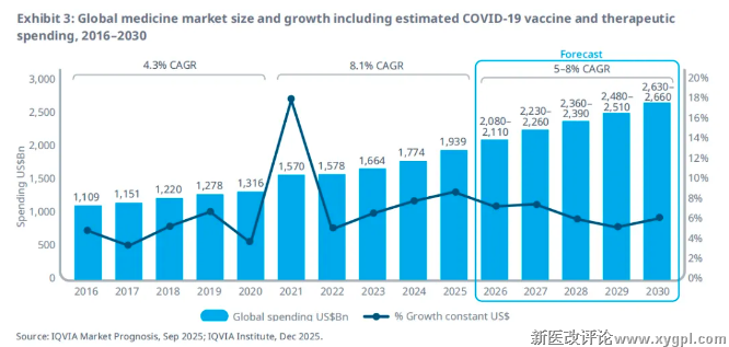 预计到2030年,全球药品支出(向制造商采购药品的金额,不含发票折扣和返利)将超过2.6万亿美元,并以每年5%-8%的速度增长。