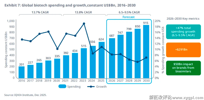 生物技术药物在五年内的累计增幅将达到47%,截至2030年的年均复合增长率(CAGR)为6.5%–9.5%,在此期间全球支出将增加2910亿美元。