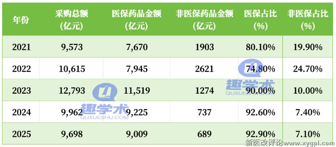 3月16日,国家医保局公布2025年医保事业发展统计快报(以下简称统计快报)给出了答案,中西药占比,医保和非医保药品销售整体销售,创新药销售情况等等都有详细数据。一个值得关注的是,2021年到2025年的5年间,医保多花了1339亿采购药品,支付能力在逐渐提高。