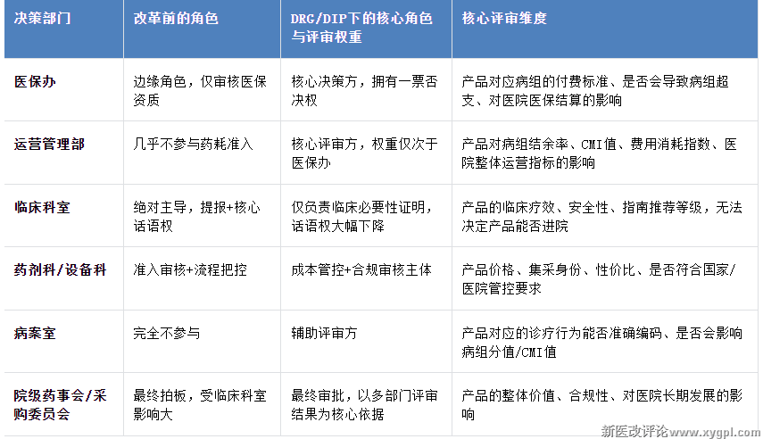 DRG/DIP落地后,以大型综合医院为先驱,开始逐步告别了“科室主任提报、药事会拍板”的单一路径,形成了多部门联动、全维度评估、一票否决制的联合评审体系,各部门的话语权和评审维度发生根本性变化。