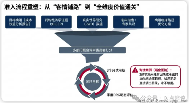 1.产品进院端:从“客情驱动的单部门准入”,变为“价值驱动的多部门联合评审”,没有明确临床价值和成本效益的产品,无法完成进院,即便进院也会被动态考核淘汰;