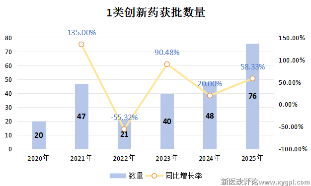 在药监改革、医保支持等多重政策共同发力下,根据官方数据显示,2025年我国药品领域临床急需产品上市实现跨越式增长,国家药监局全年批准药品上市的 1类创新药76个 , 同比增长58.33% ,创历史新高。