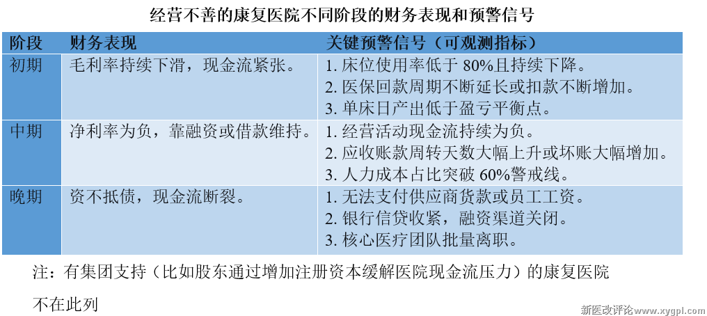 绝大多数民营康复医院既无法像公立医院一样获得稳定的财政支持和患者信任,又无法像高端私立医院那样完全依赖高净值自费客户。因此,经营能力从某种程度上决定了民营康复医院的生死。从重要性来说,现金流>利润>收入。医院经营短期看现金流,中长期看利润和收入。如何建立稳定的低成本获客渠道,如何在不影响运营品质的前提下最大限度地压缩成本(尤其是人力成本),如何避免内耗,最大程度地提高医院的运营效率,是医院运营必需要解决的三个问题。这种情况下,一个懂医疗、懂医保、懂本地化运营的团队显得尤为可贵,这样的团队可以避免很多的“坑”,少付很多不必要的“学费”。如果医院病源枯竭、成本失控、效率低下,将不可避免地踏上经营不善的“斩杀线”。经营不善型斩杀线类似于慢性失血,不会马上致命,不同阶段有着不同的财务表现和预警信号。见下表。