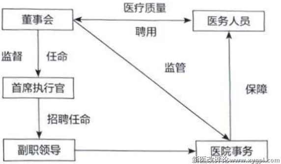 美国是当代最典型的自由市场经济国家,以私有制为基础,以经济决策高度分散为特征,完全实行自由经济、自由经营、自由竞争,政府对经济的干预十分有限。在医院管理上采用企业管理模式和方法,强化内部权力的相互制约监督(图1)。