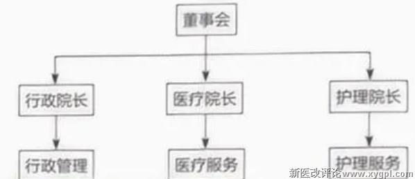 首席执行官(或院长)负责实施董事会决议,自主招聘多个副手以分管不同事务,全面主持医院各项管理工作。医务人员在医疗机构中是保持独立和自治,但需要在医疗质量上对董事会负责。
